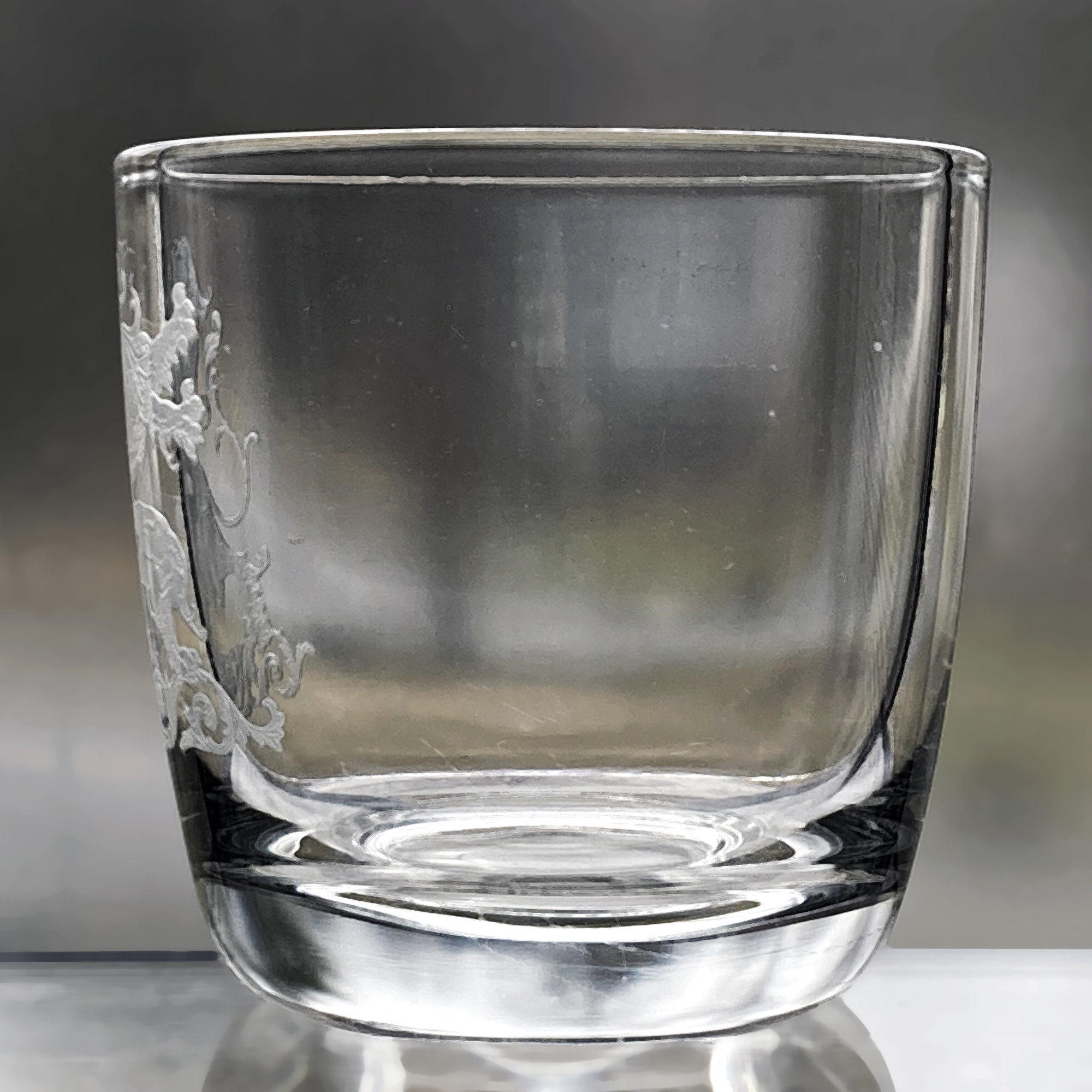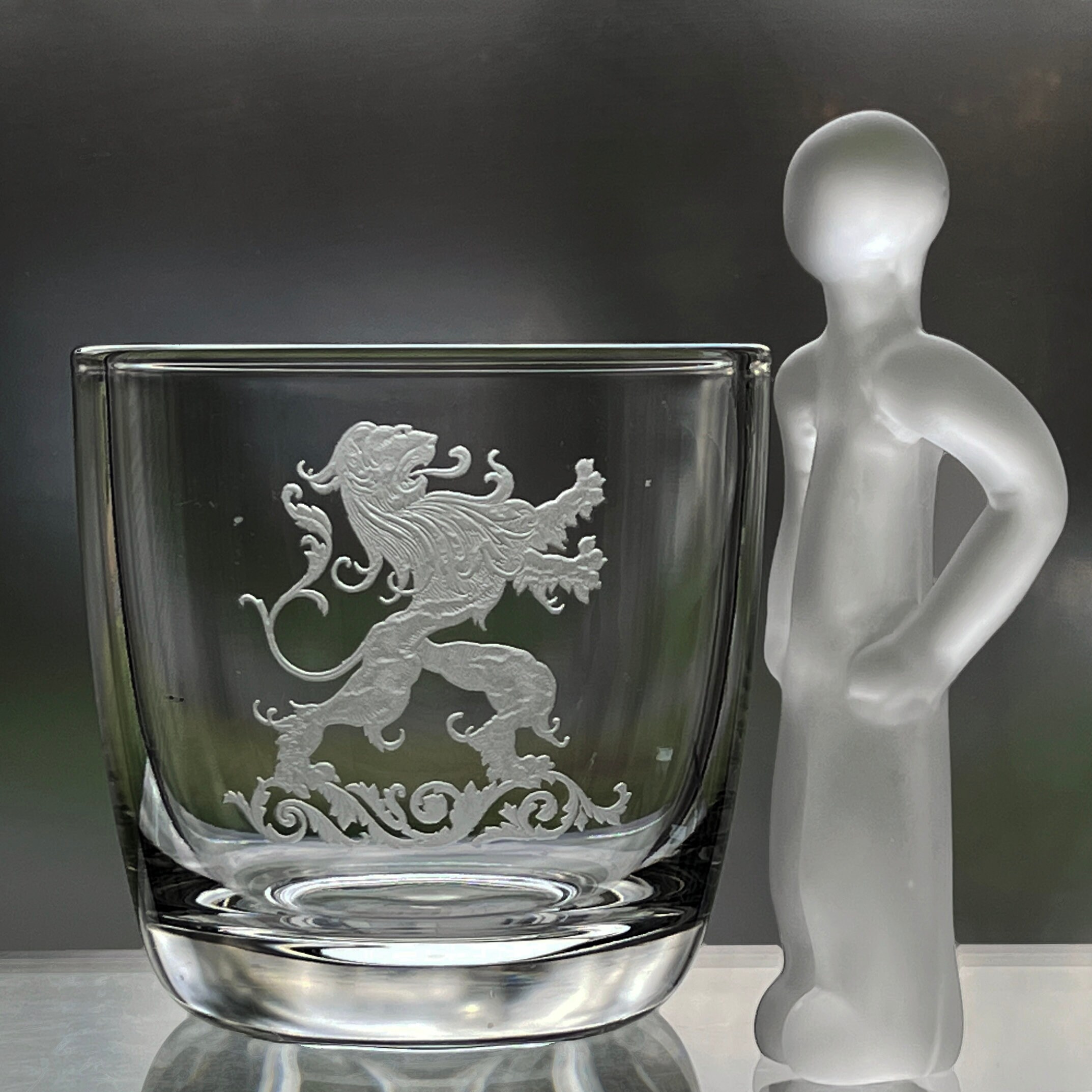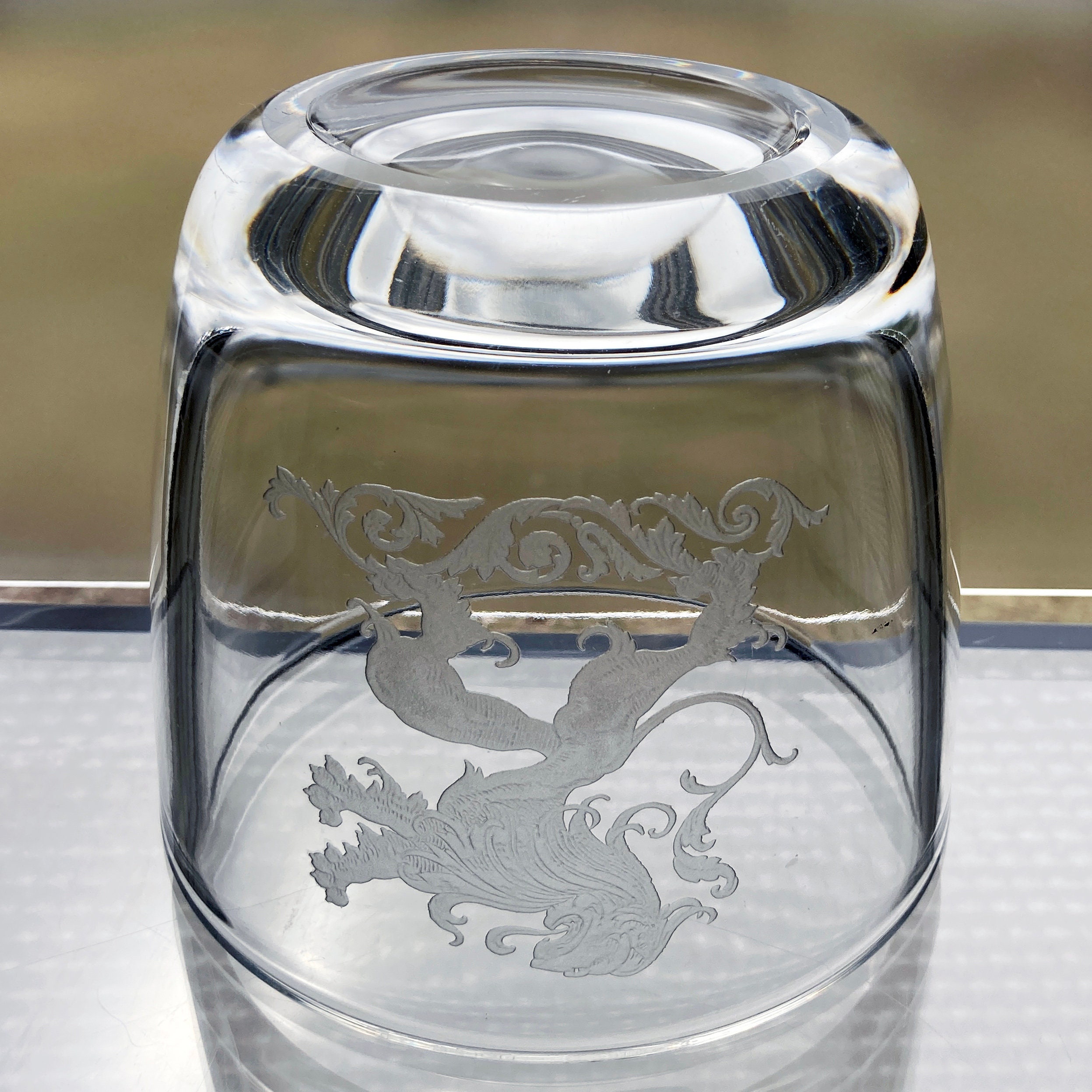 This heavy piece of American etched glass was made by the Glastonbury-Lotus Company, likely in the 1960s. The etched lion design, called "Leo," was introduced in 1956 and has since been discontinued. The pattern was used on a variety of glass barware, including this ice bucket. The vessel is about 6" in diameter and 6" tall, and it weighs nearly 4 pounds. It has one small black inclusion, but is in great shape otherwise.