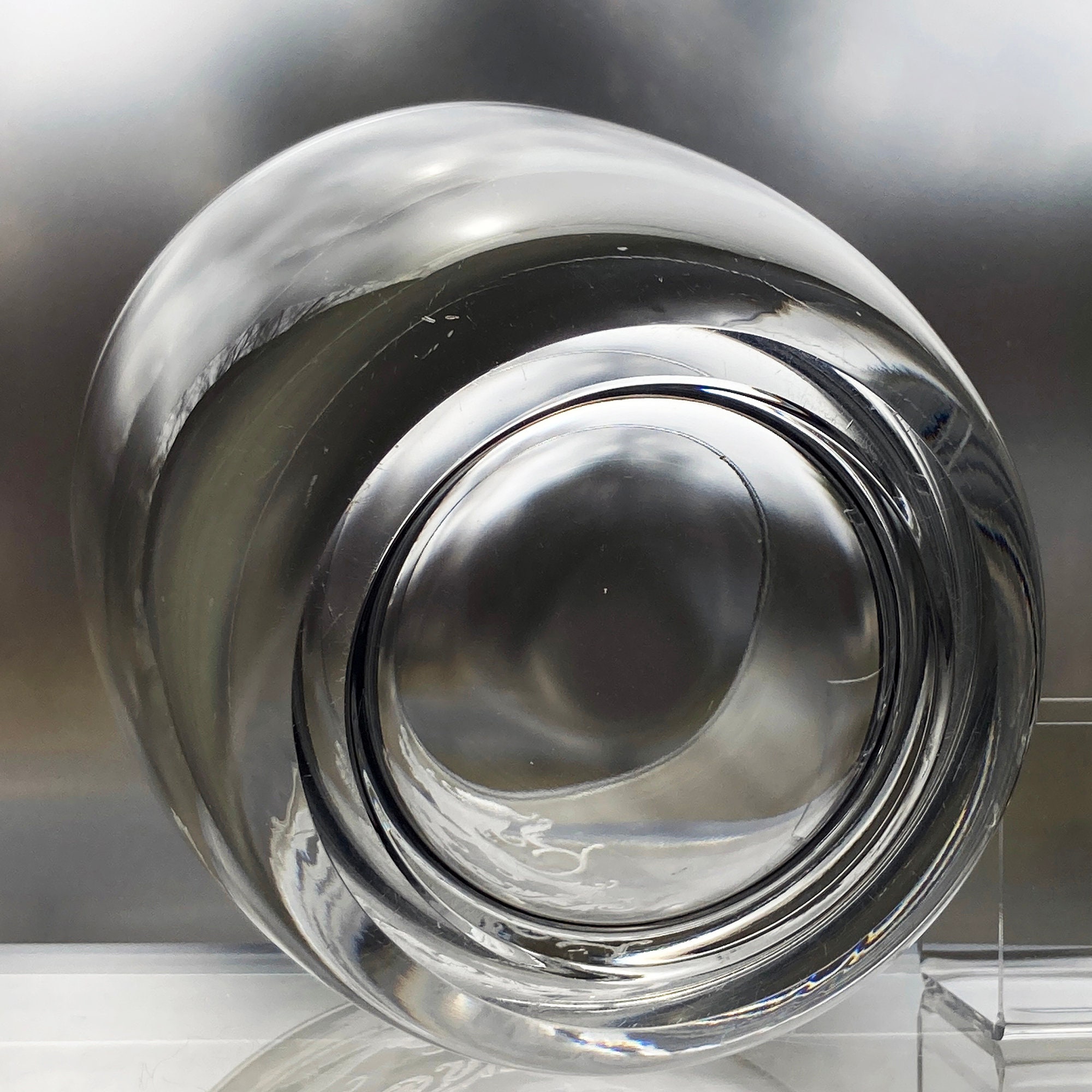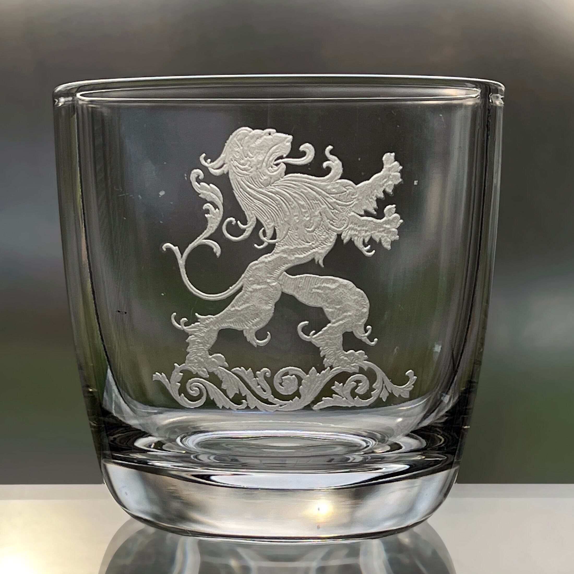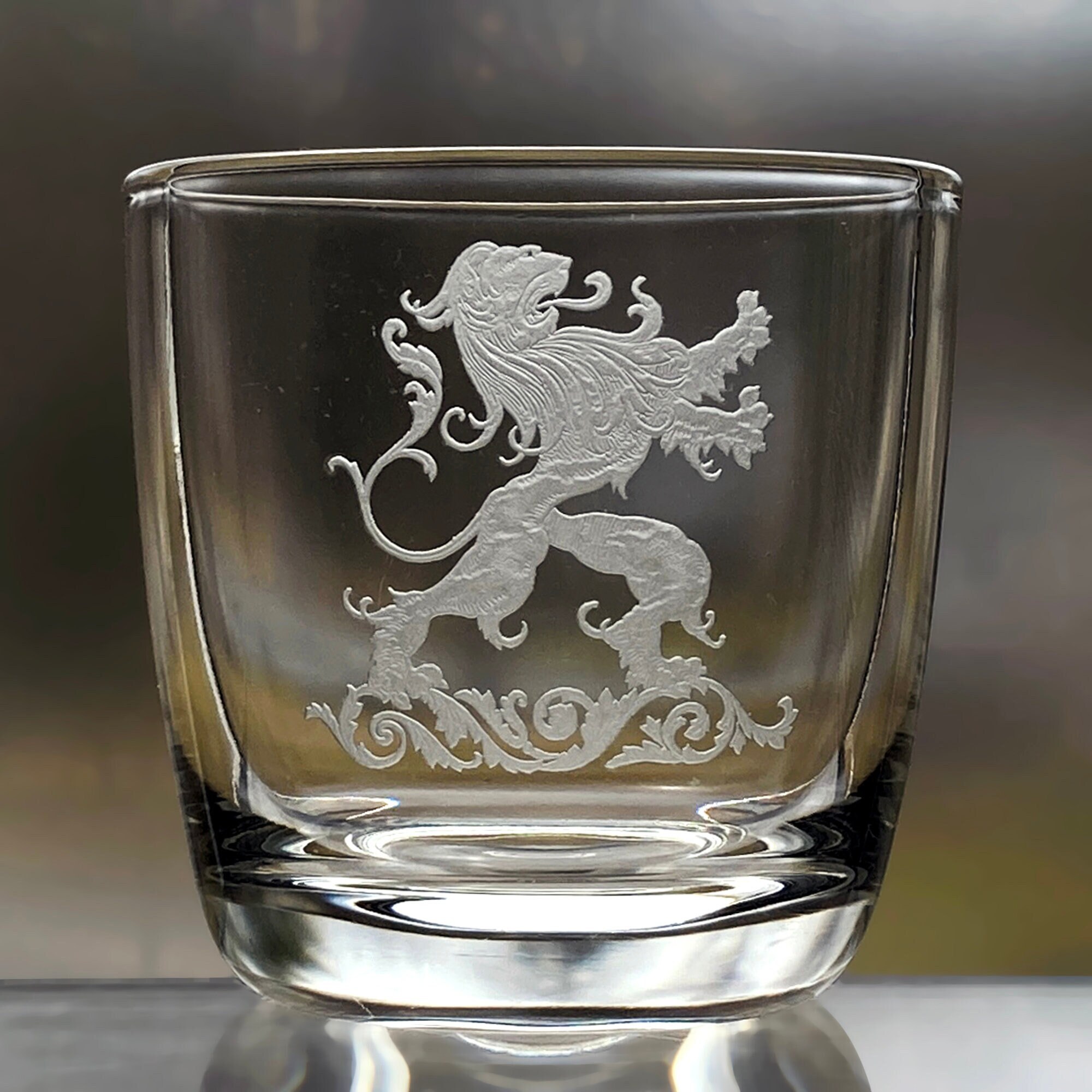 This heavy piece of American etched glass was made by the Glastonbury-Lotus Company, likely in the 1960s. The etched lion design, called "Leo," was introduced in 1956 and has since been discontinued. The pattern was used on a variety of glass barware, including this ice bucket. The vessel is about 6" in diameter and 6" tall, and it weighs nearly 4 pounds. It has one small black inclusion, but is in great shape otherwise.