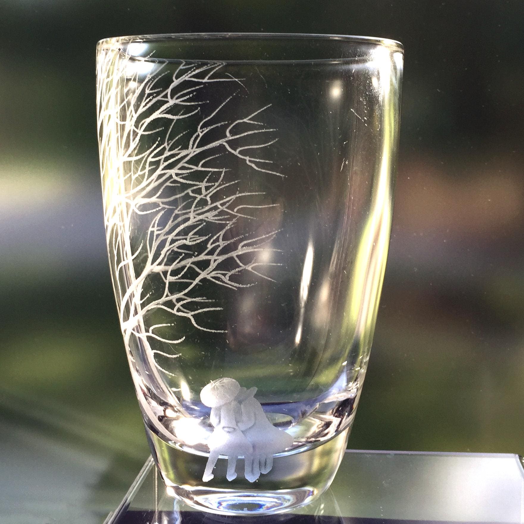 This small vase, designed by John Orwar Lake, has an engraving designed and executed by Gert Claesson, who was a craftsman at Ekenäs Glassworks for many years. It depicts two friends or lovers huddling under an umbrella, beneath the bare winter branches of a large tree. The traditional copper-wheel engraving is skillfully done, wrapping the tree branches around the vase. The scale of the tree to the people gives one a heightened sense of the struggle they are having against the elements, or of the peace they will find under the protection of the massive tree.