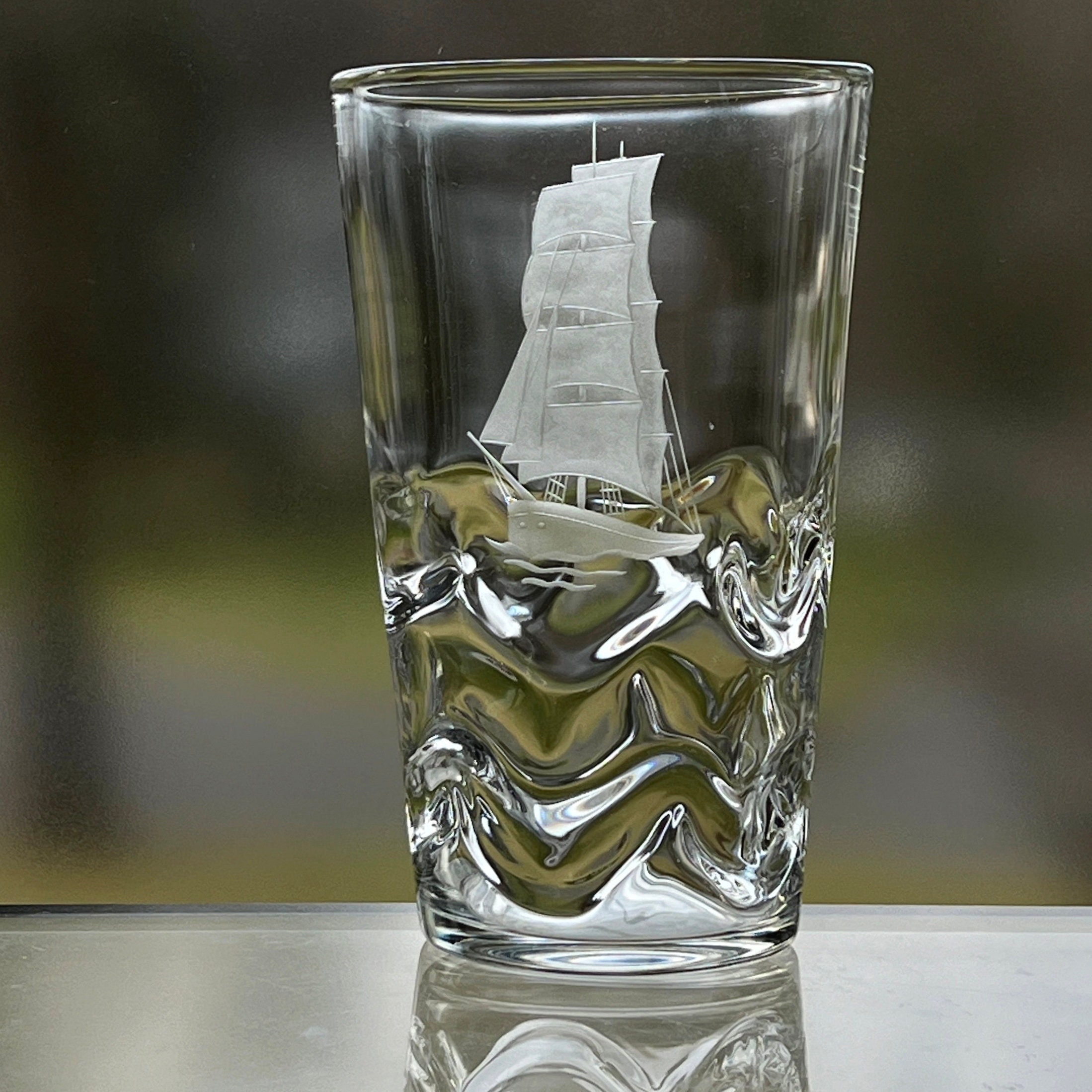 Designed by Vicke (Victor Emanuel) Lindstrand in 1937, this heavy, round vase is hand blown and copper-wheel engraved. The glass is manipulated while hot to create ripples in it, giving the impression of water. It is about 7.5 inches tall and 4.5 inches in diameter, and it weighs 2.25 pounds. This particular piece was made in 1956; I don't know the mark of the engraver.