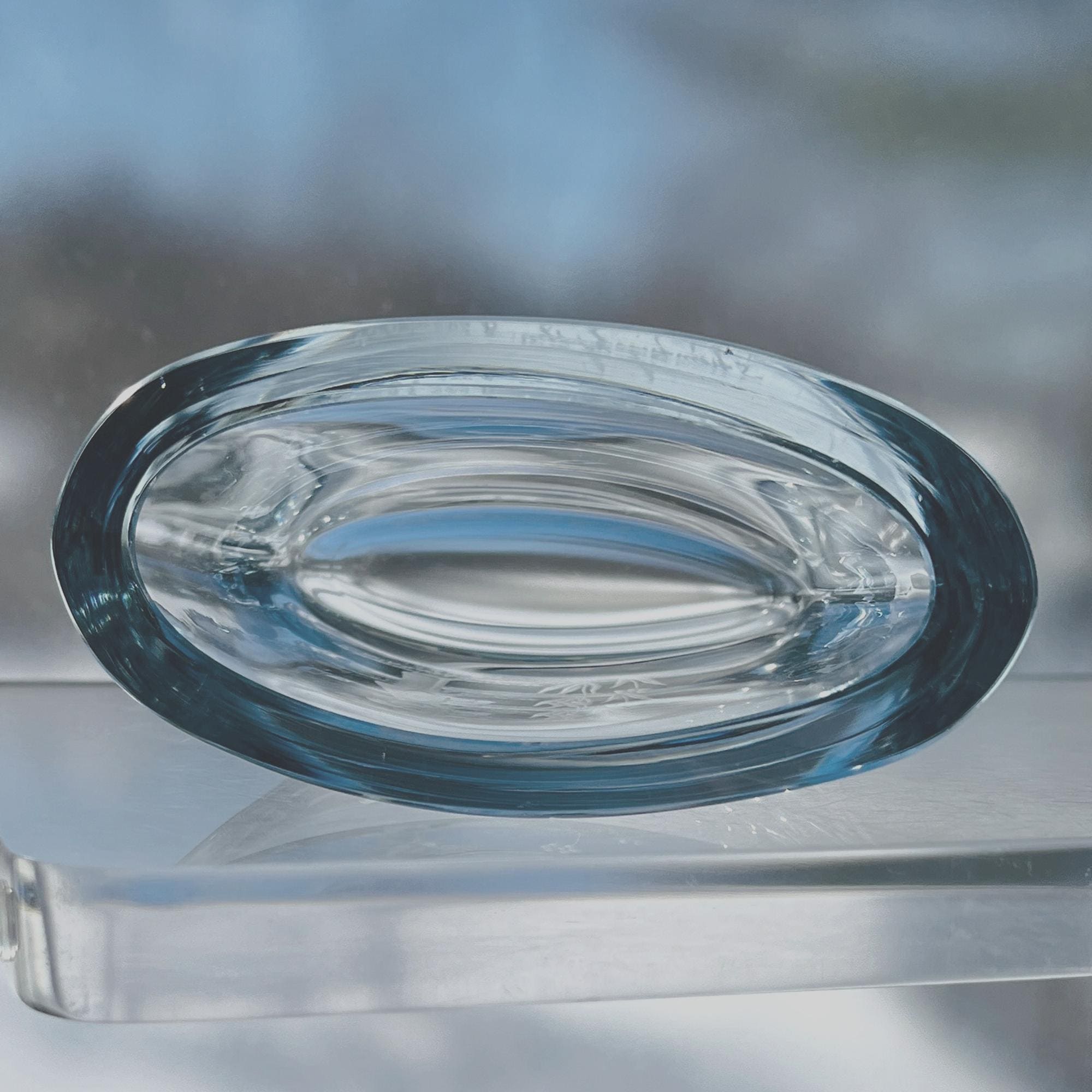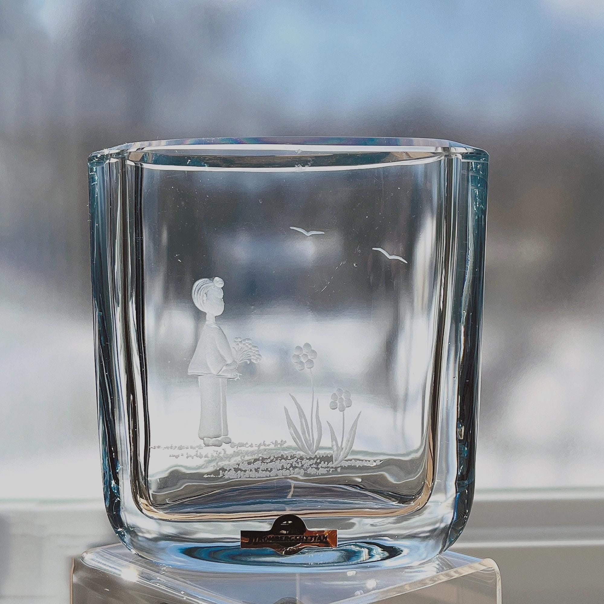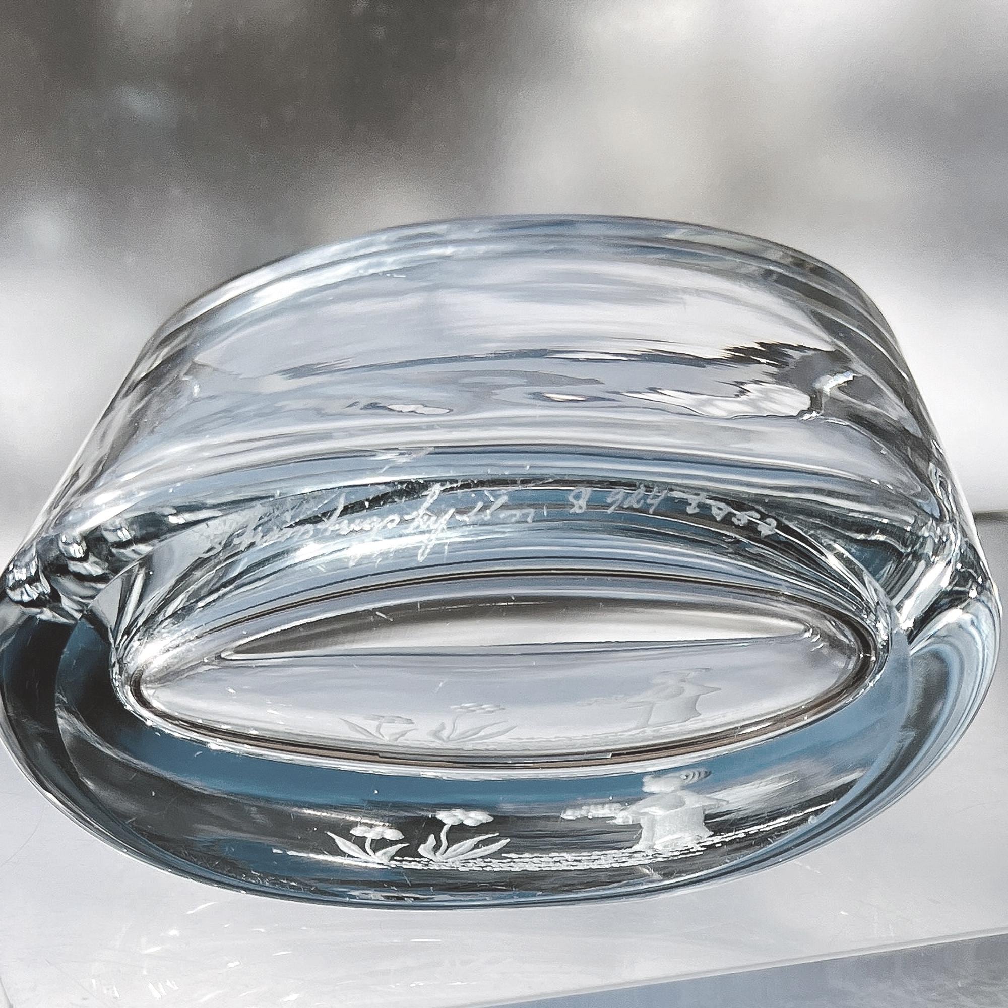 It is a medium-sized vase, about 5.5 inches tall and 5 inches across, and heavy, weighing 2.7 pounds. It is in excellent condition, clear and sparkling, with just a tiny flea bite on the front rim, as seen in the photos. The base is fully signed, and the numbers on its base tell us about the date of the vase design and the motif design. The vase, B924, and the motif, C952, were both designed in the late 60s or early 70s. The photos show how the depth of color changes with the light, from barely blue to a bright, vivid hue.