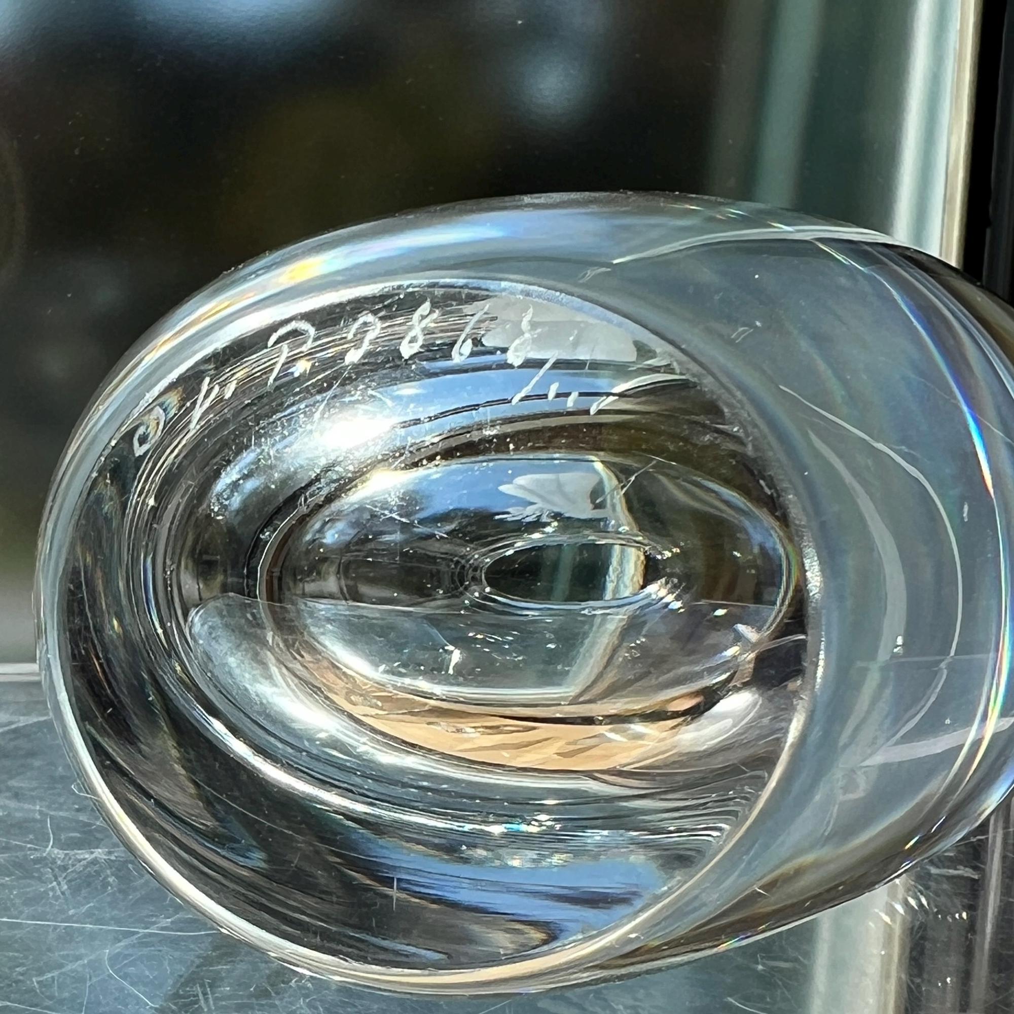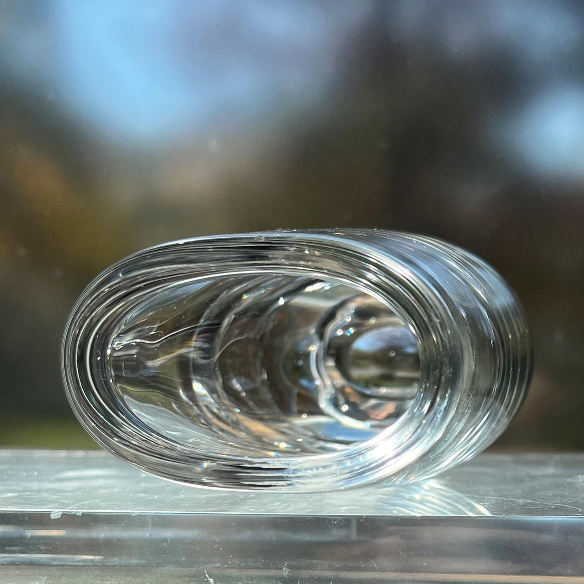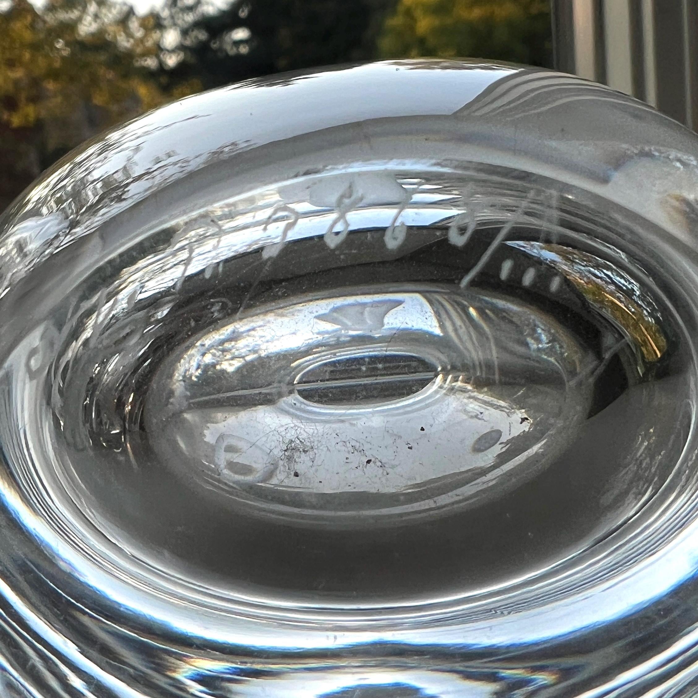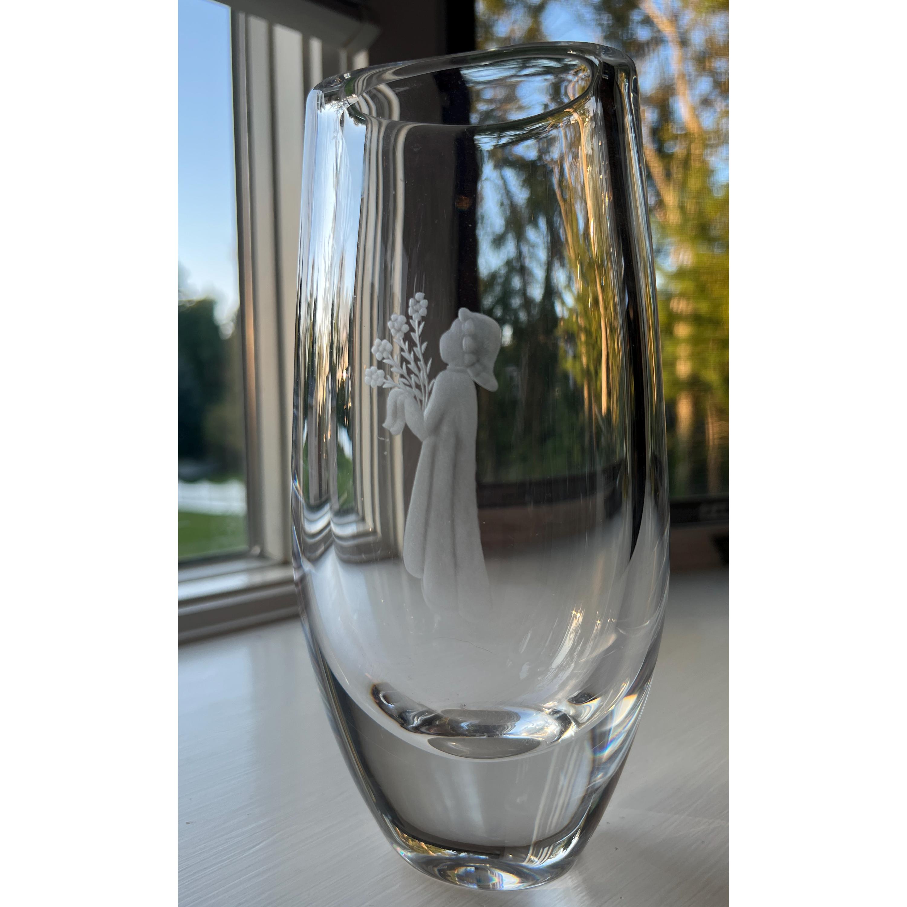 Designed by Sven Palmqvist and copper-wheel engraved, this crystal vase is a perfect example of Swedish craft in the mid 20th century. The vase is 4 inches wide and 7.5 inches high, and it weighs about 3 pounds. The design number 3868 tells us that the vase was designed in the 1960s, likely from an earlier motif. Pieces like these were often exported to the USA or sold as souvenirs in Sweden. This one has some small scratches in the glass, a sign that it was loved.