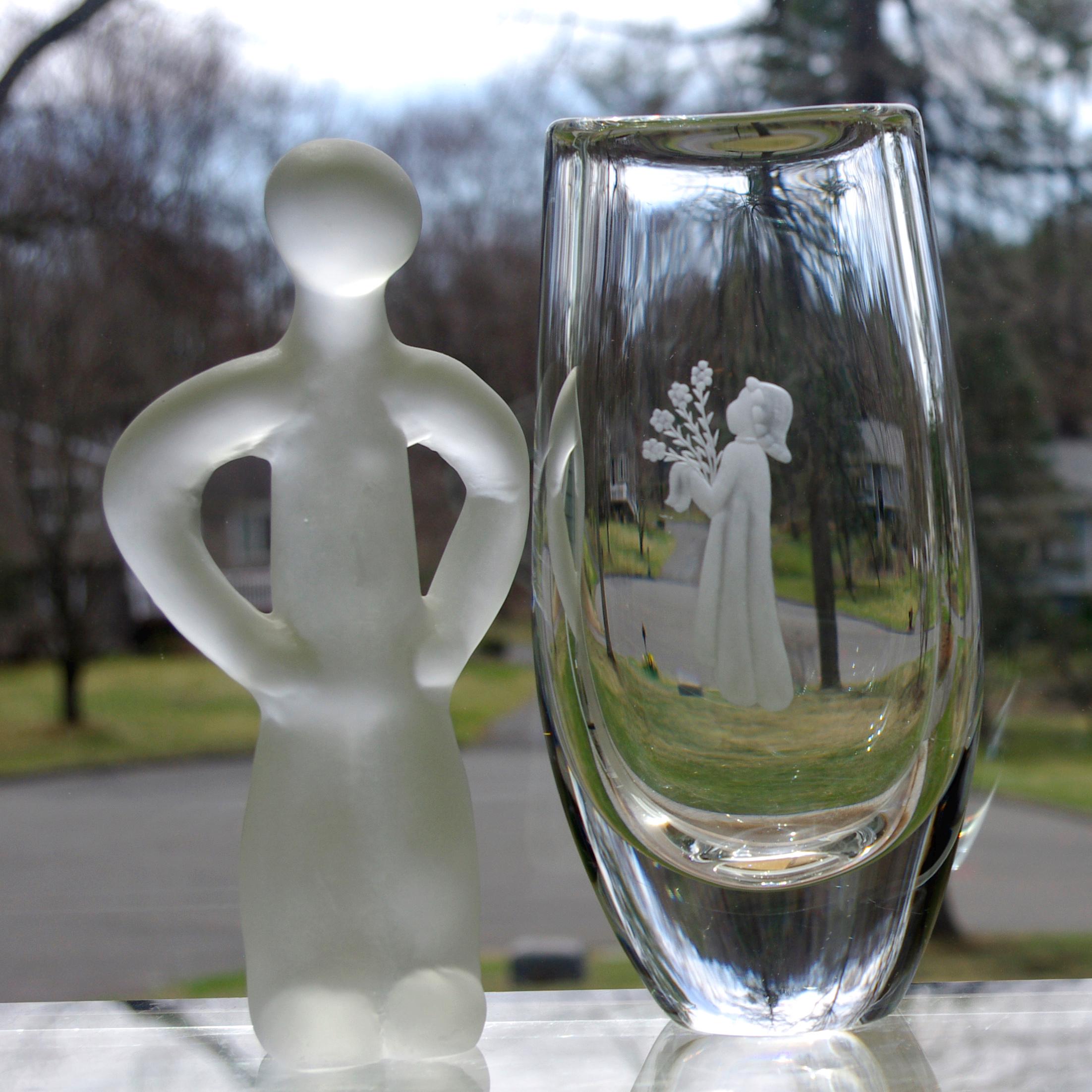 Orrefors employed master artists and craftsmen, some of whom worked their whole careers of 40, 50, or more years with the company. Sven Palmqvist (1906-1984) was born in the glass district of southern Sweden and started his career with Orrefors in 1928, where he remained until 1972. In those years, he designed hundreds of engraved glass motifs. Palmqvist had a particular fondness for portraying people and animals.