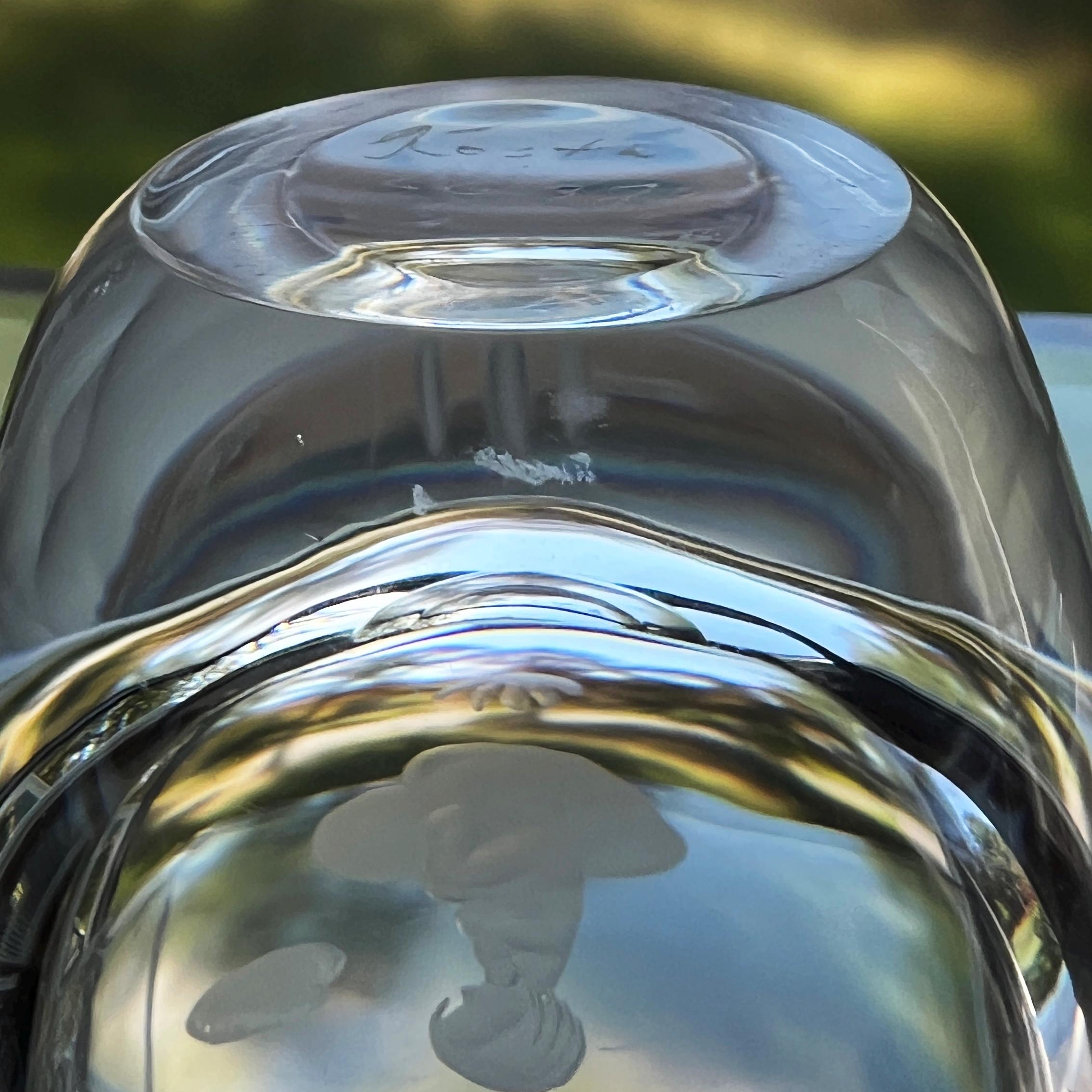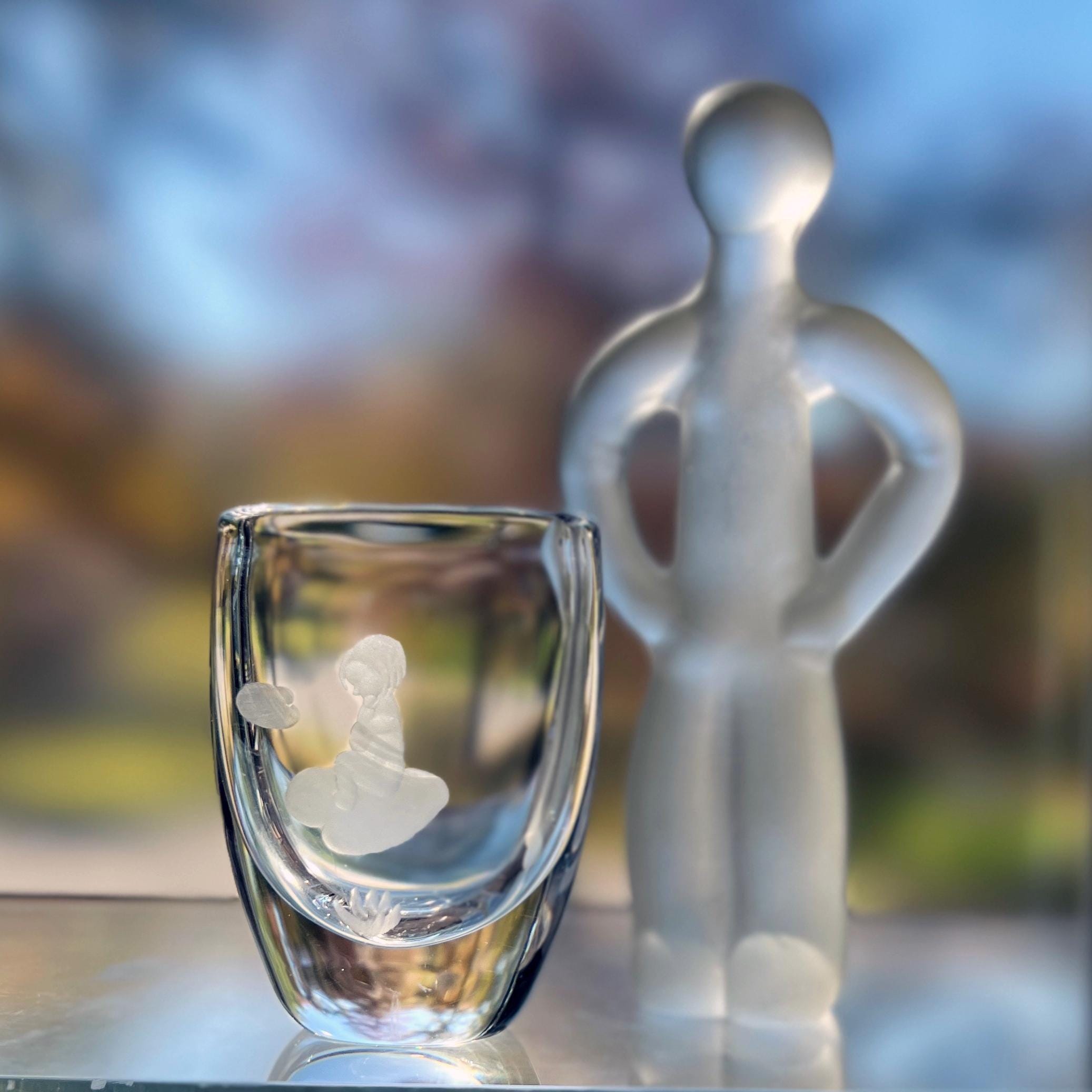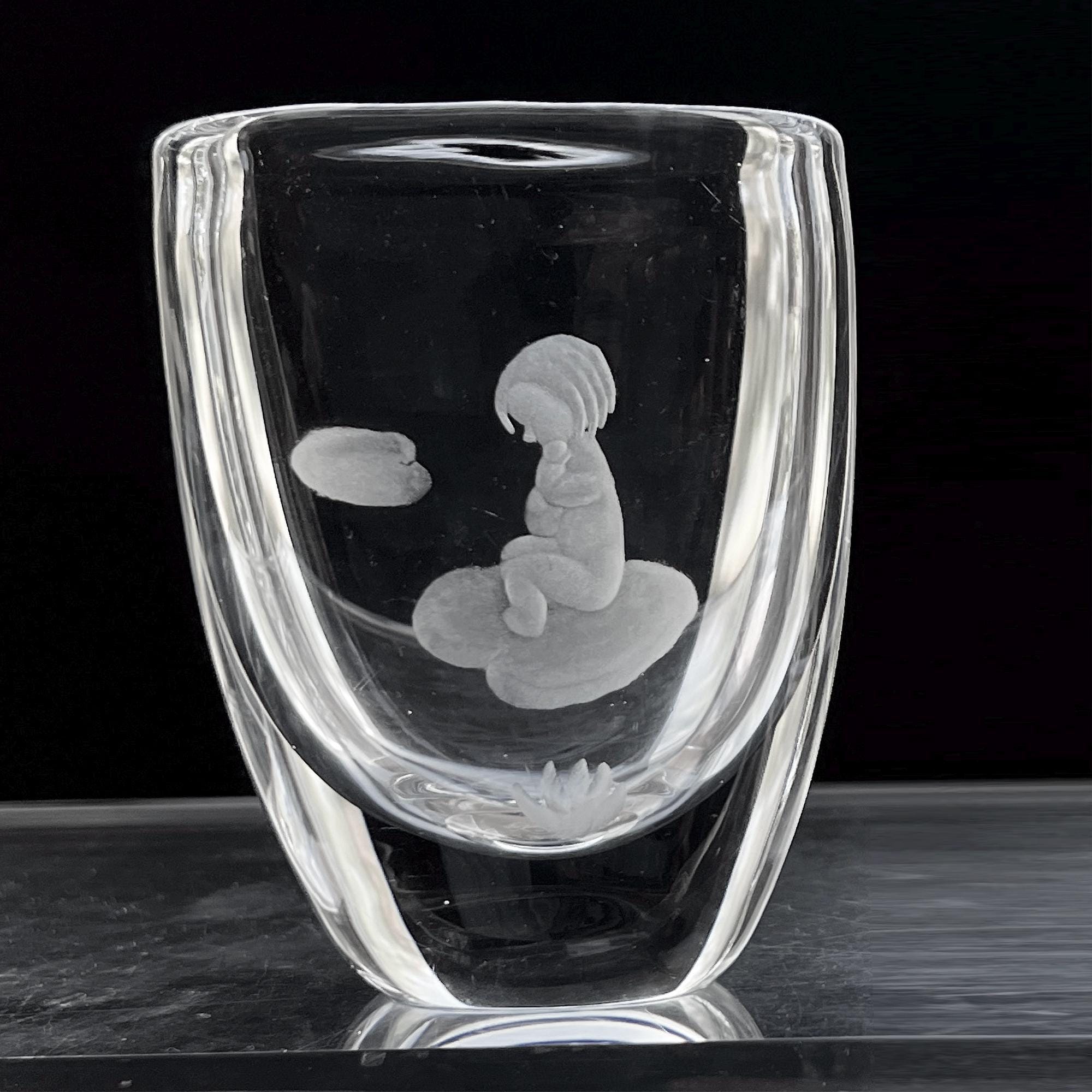 Vicke Lindstrand designed this vase while working as artistic director at Kosta Glassworks in Sweden. The vase is small, 4 inches tall and 3 inches across, and it weighs a pound. The image is Thumbelina, from the fairy tale by Hans Christian Andersen about a tiny girl who marries a flower-fairy prince.