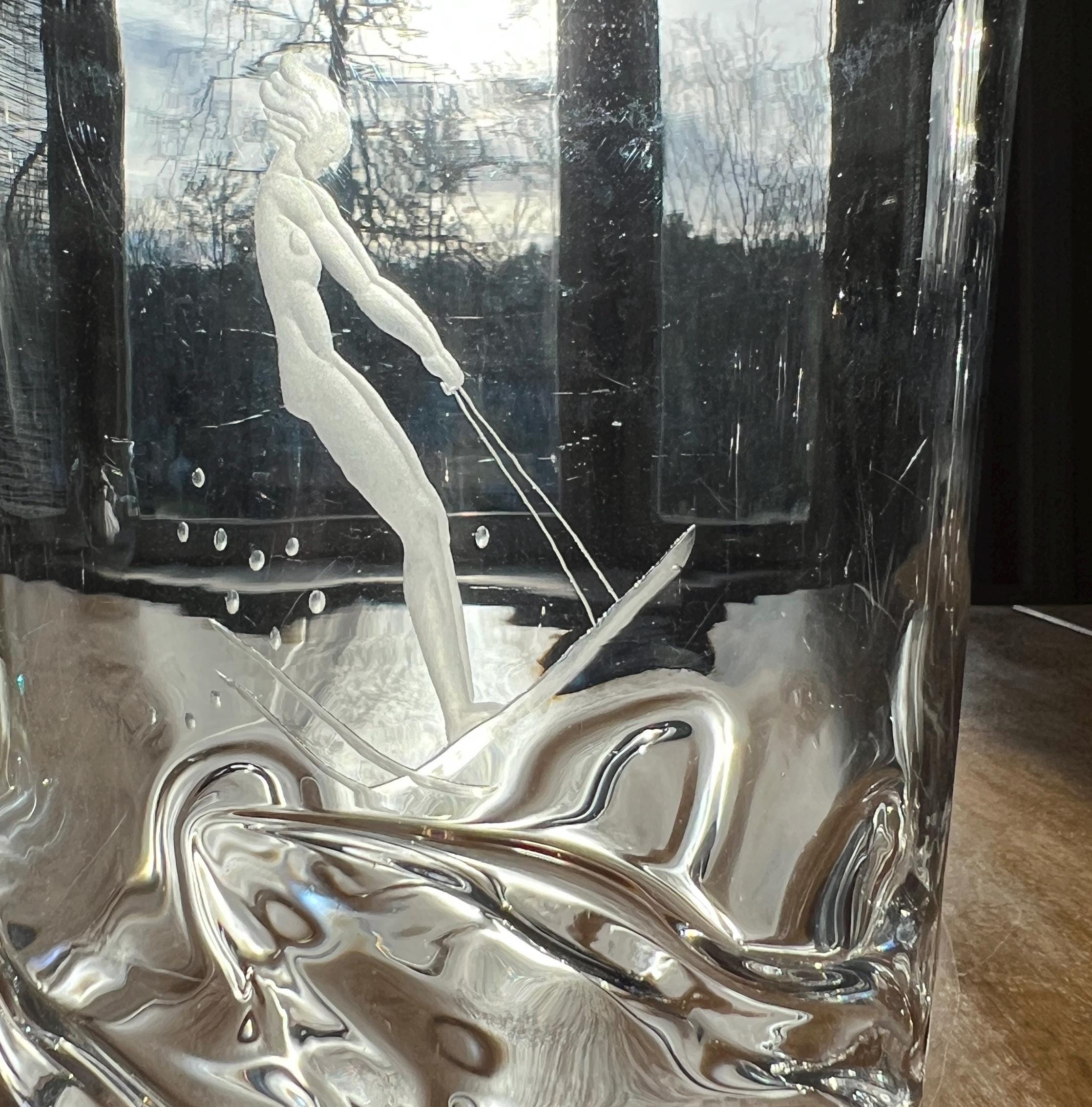 This iconic water-skiing nude woman was designed by Vicke Lindstrand in 1935. Modernist vibes run through the design; the face of the woman makes me think of Modigliani. The heavy, round vase is hand blown and copper-wheel engraved. The glass is manipulated while hot to create ripples in it, giving the impression of water. It is about 7.5 inches tall and 4.5 inches in diameter, and it weighs 3 pounds. This particular piece was made in 1938; I don't know the mark of the engraver. The vase has some very faint scratches inside, as if someone in its 87 years of life cleaned it with a too-rough cloth. That damage is slight, and the price reflects the condition.