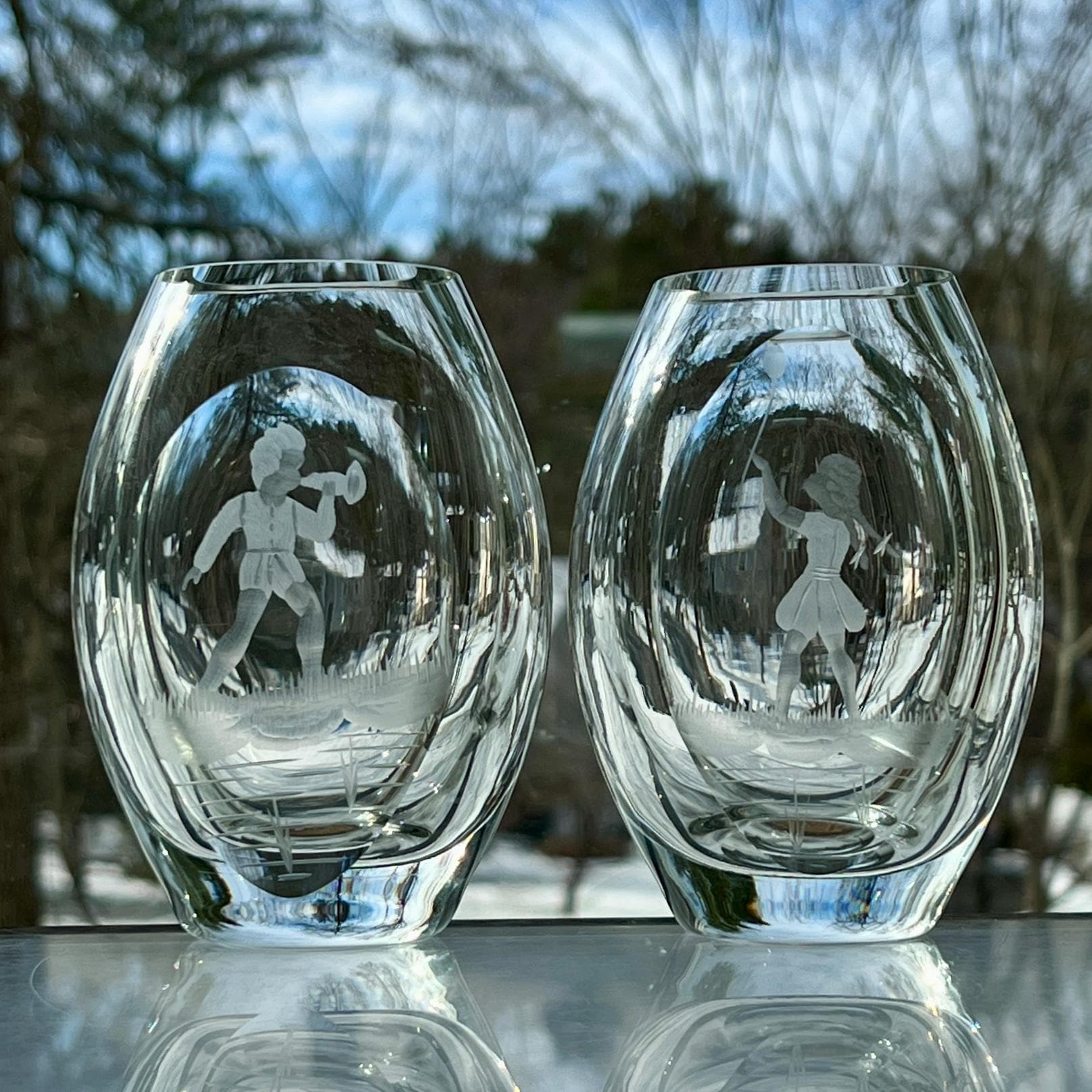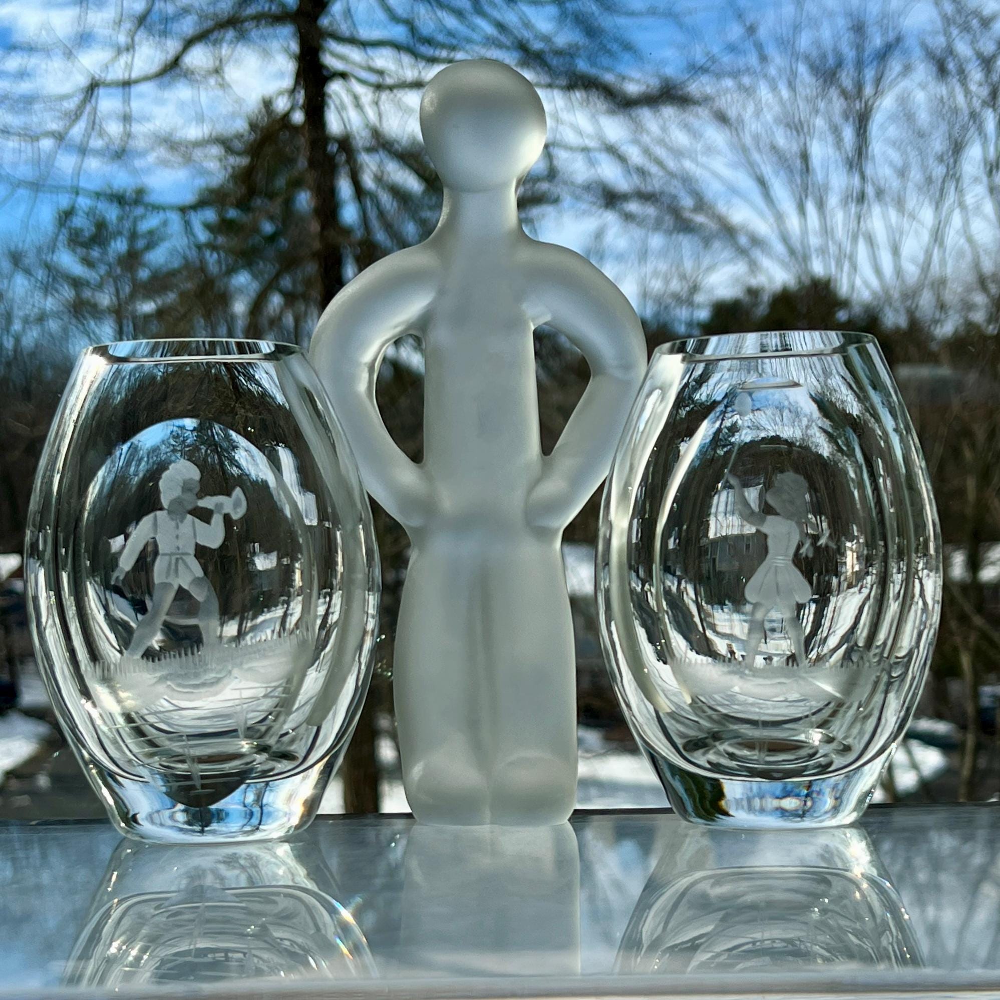 This charming pair of copper-wheel engraved art glass vases depict a boy with a horn and a girl with a balloon. They were made at Smålandshyttan Glassworks, a small mill in the heart of the Crystal Kingdom, and one of about 60 glassworks active in Sweden during the 20th century.