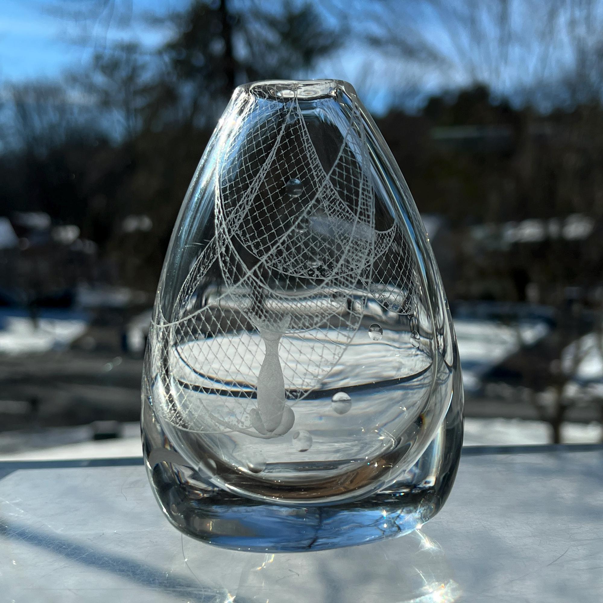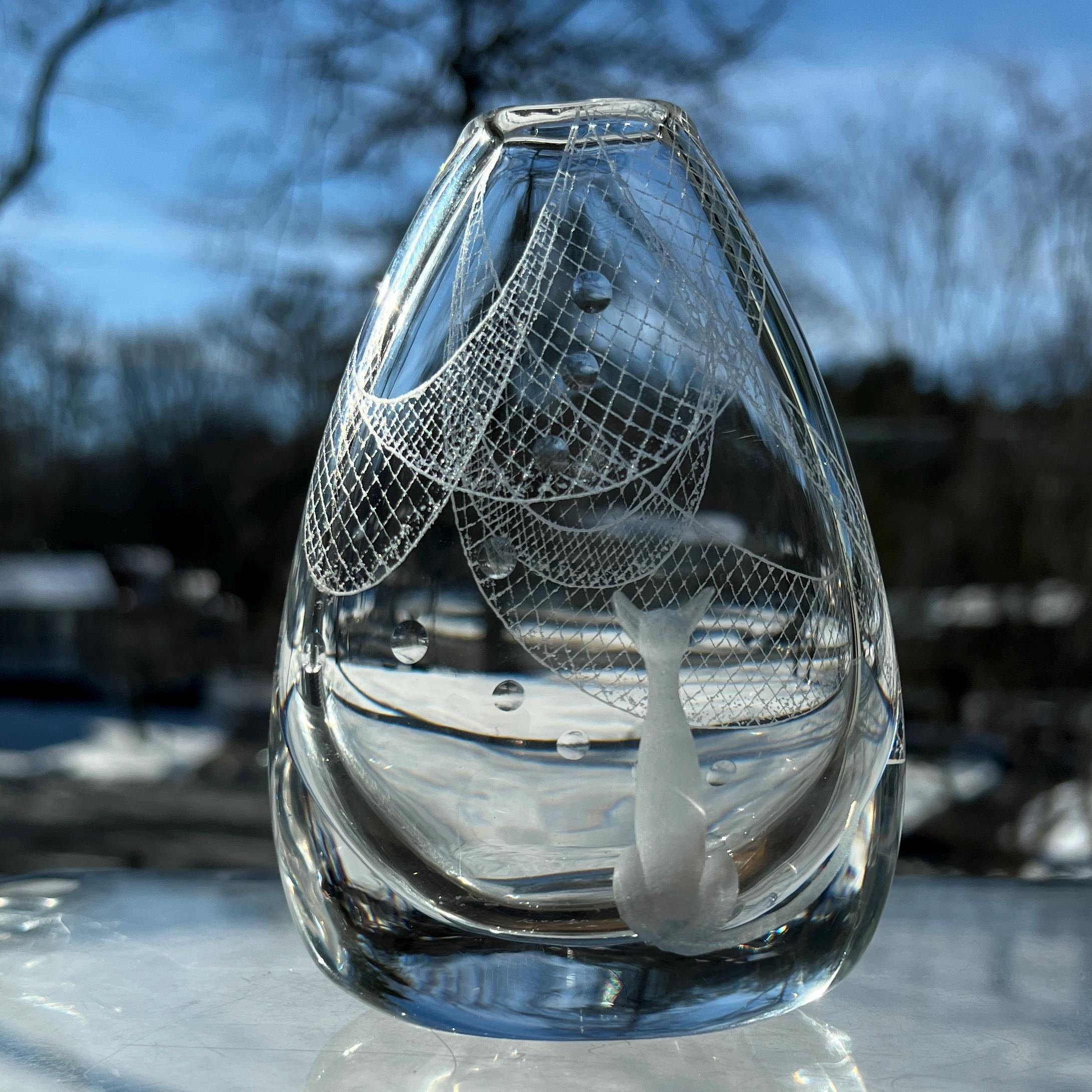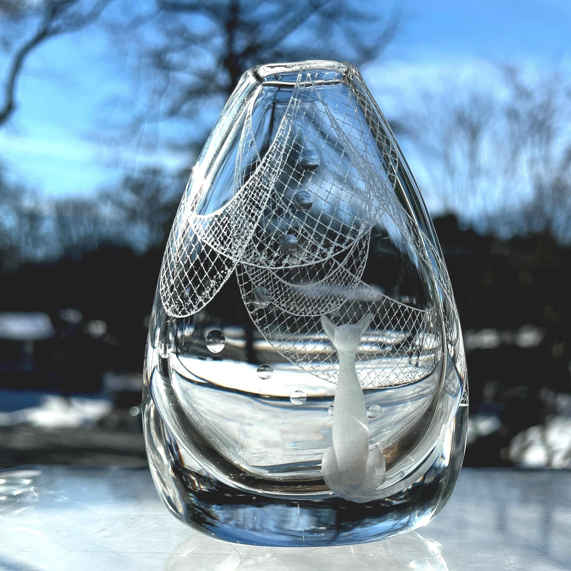 Vicke Lindstrand designed this vase while working as artistic director at Kosta Glassworks in Sweden (before they became Kosta Boda.) It is one of a series of cats and fishermen he drew to be immortalized in glass. The fine mesh of the nets is remarkably engraved, probably with a diamond engraving tool.