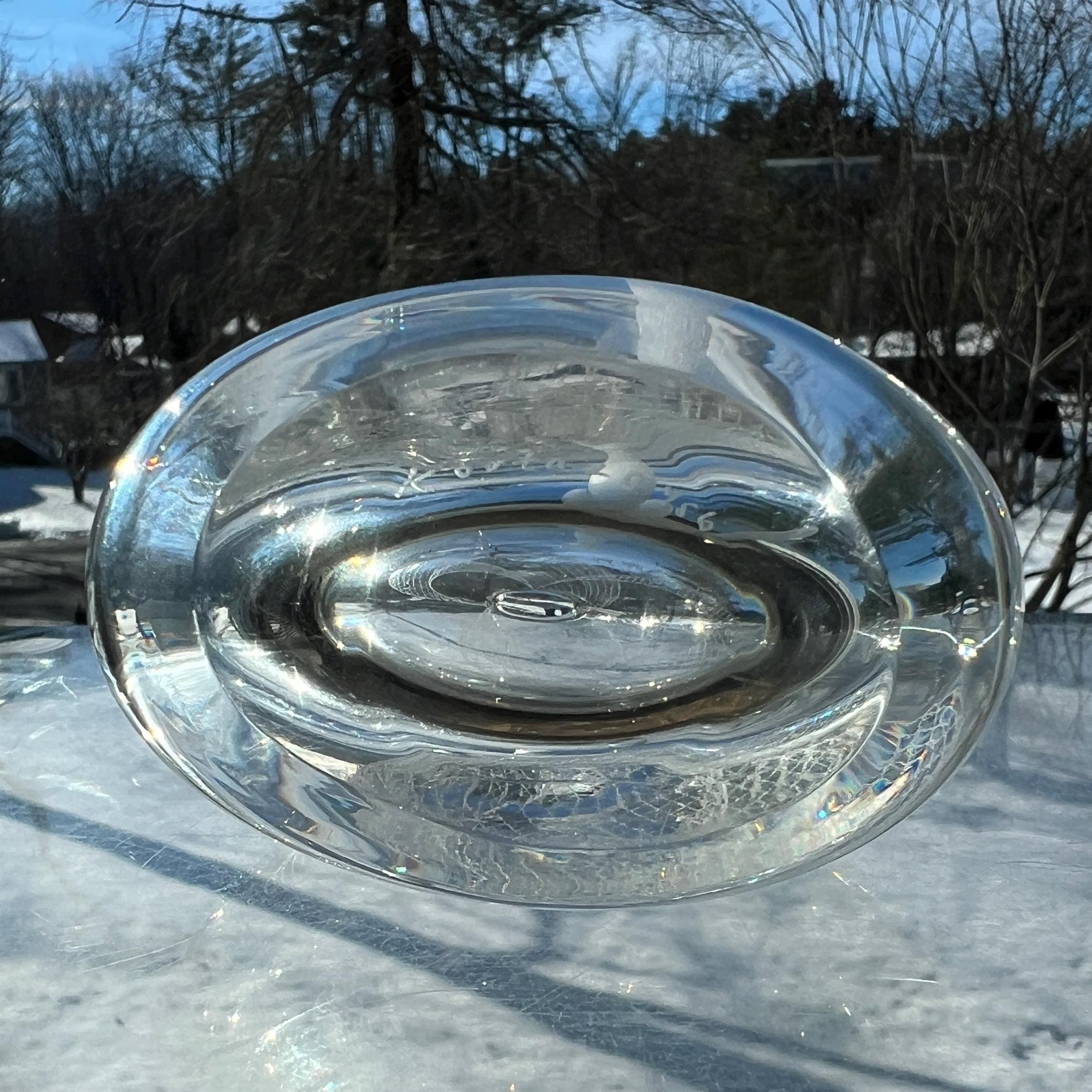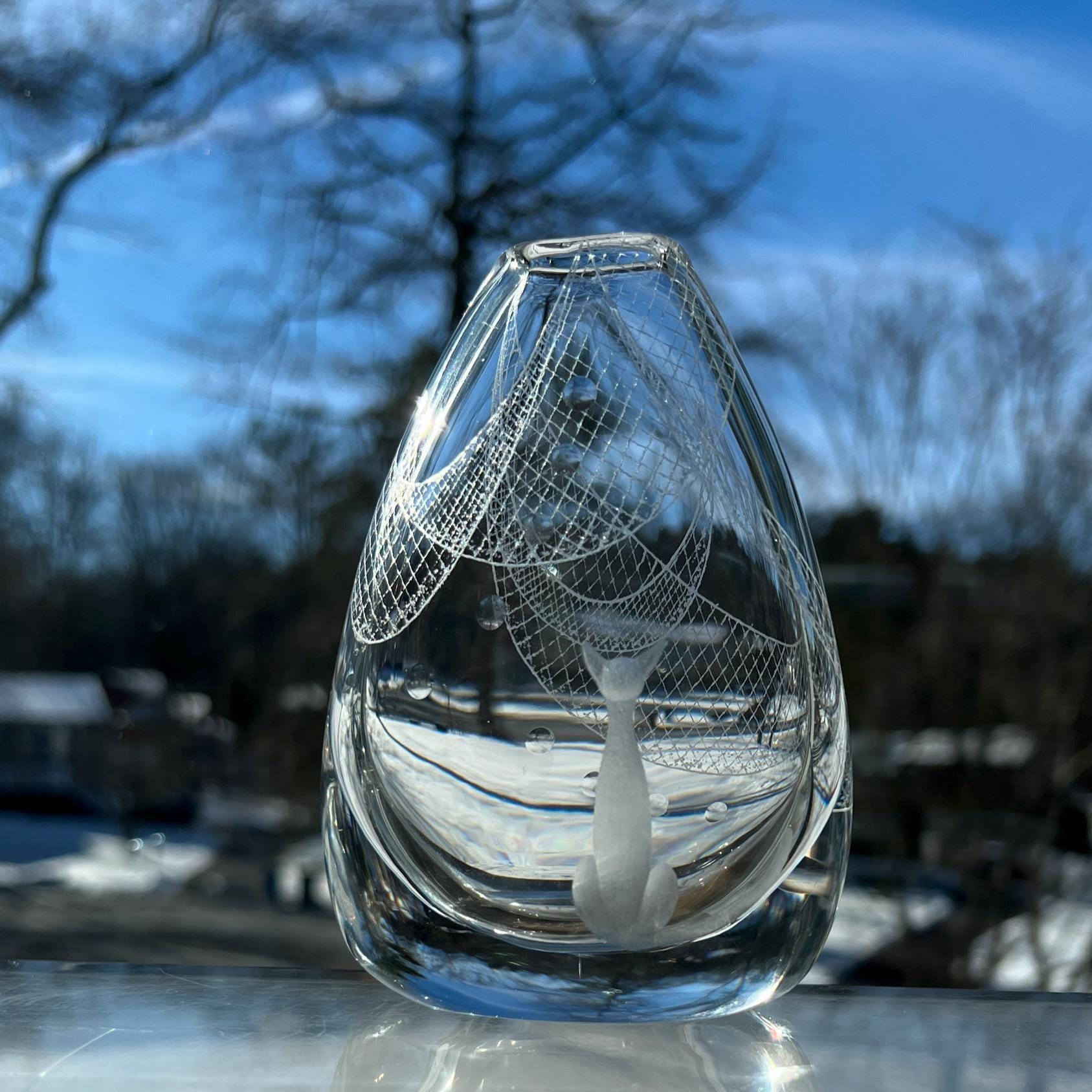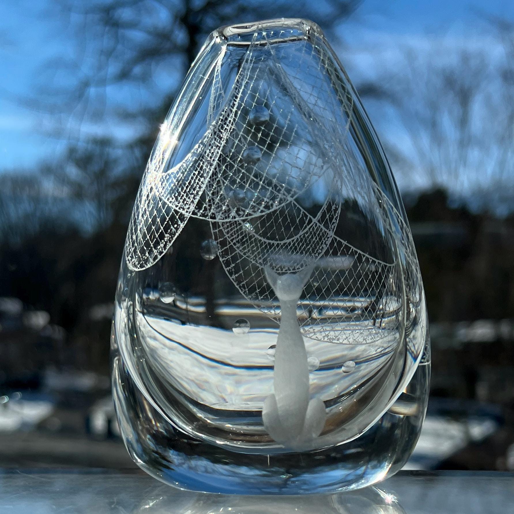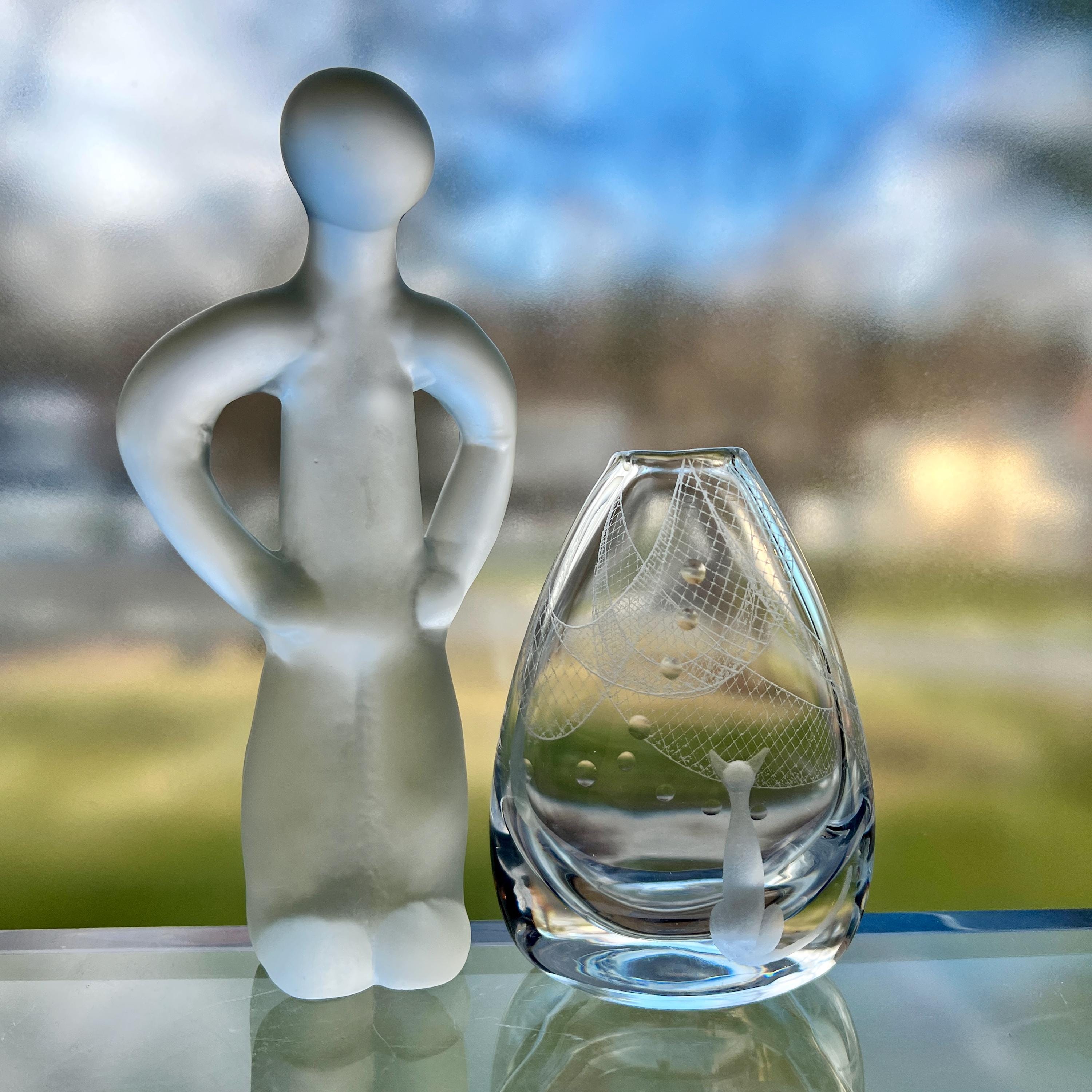 Vicke Lindstrand designed this vase while working as artistic director at Kosta Glassworks in Sweden (before they became Kosta Boda.) It is one of a series of cats and fishermen he drew to be immortalized in glass. The fine mesh of the nets is remarkably engraved, probably with a diamond engraving tool.