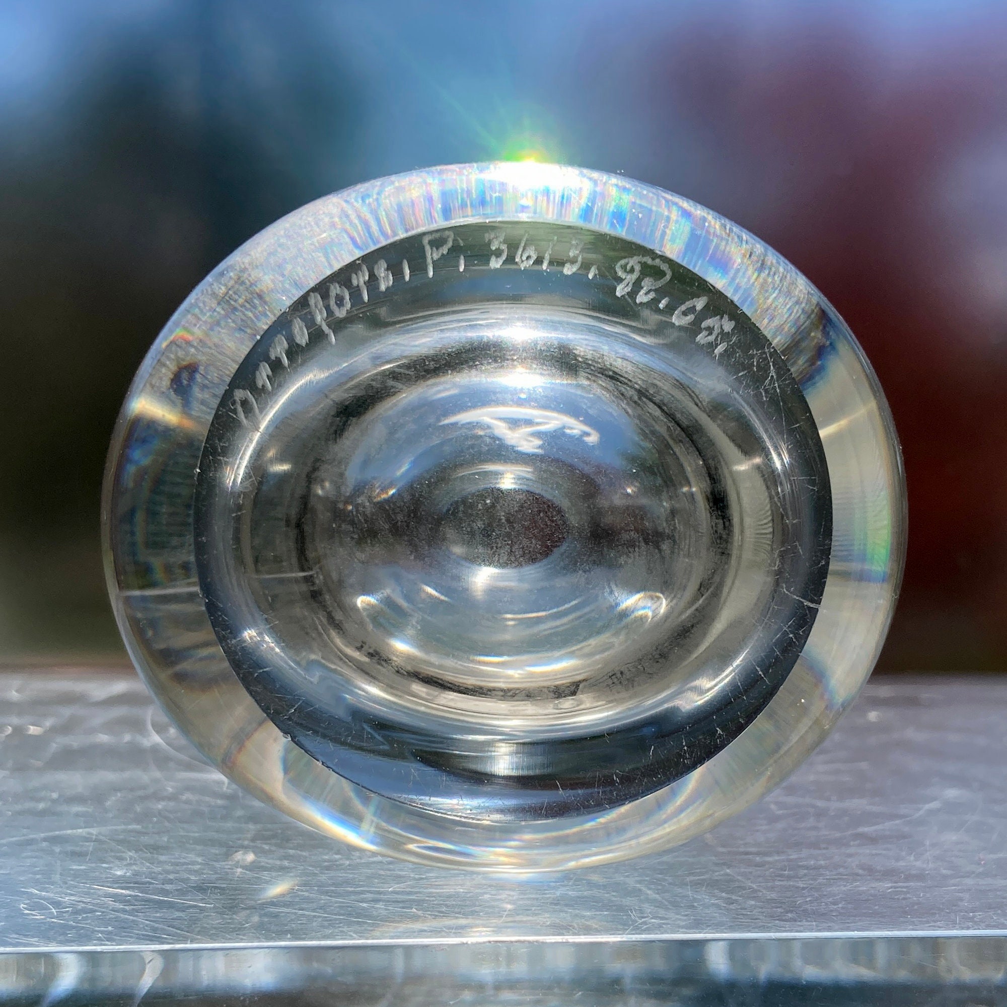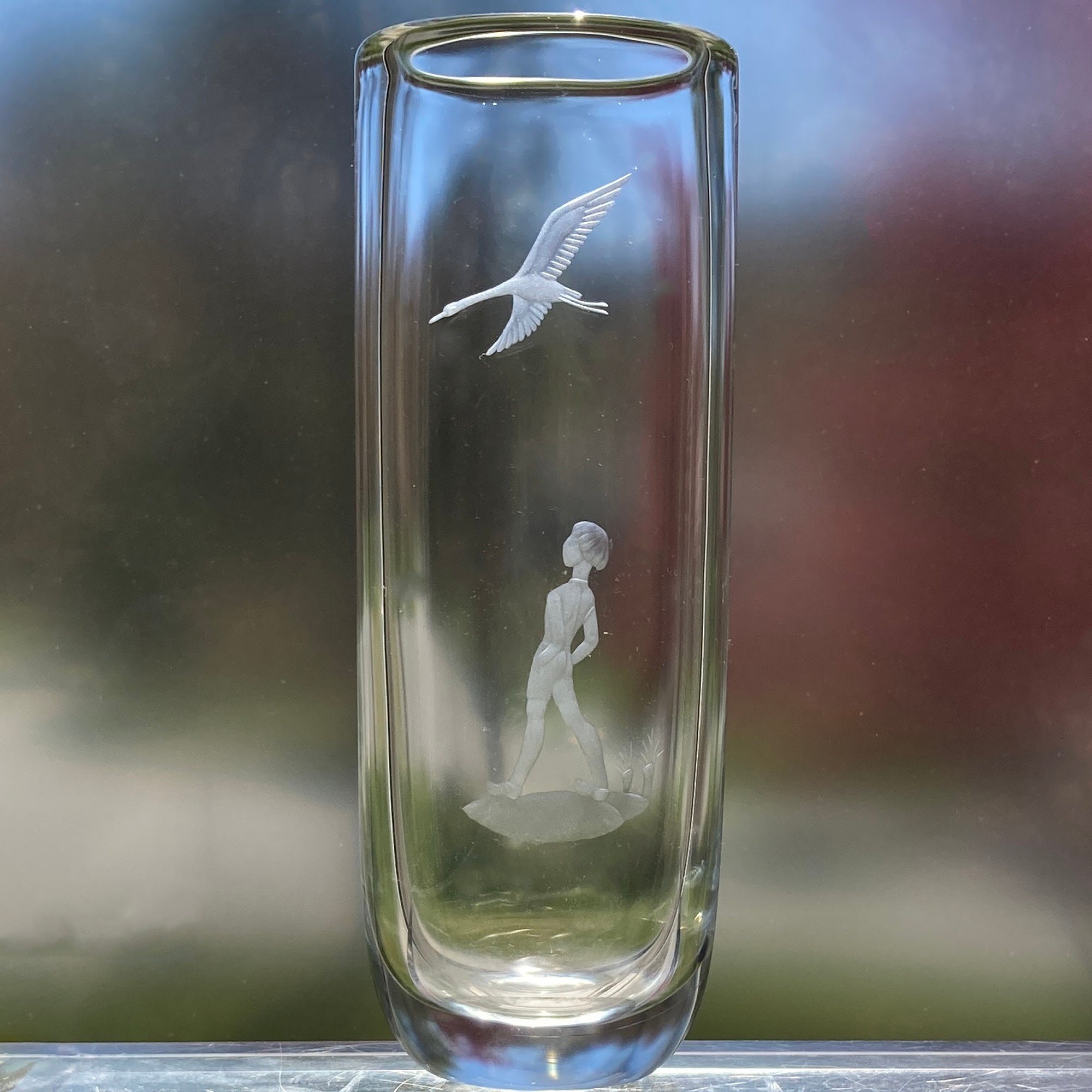 This is a tall vase, about 8" tall and 3" across the rim. The lead crystal makes the vase rather heavy; it weighs three pounds. There are very few scratches or other imperfections on the piece - it's in great condition. The design code 3613 tells me it was designed in 1956, and the date code C5 means that this particular piece was made in 1957. The stylized initials RR refer to the engraver, Ragnar Rosenstam, who worked at Orrefors from 1921-1964.