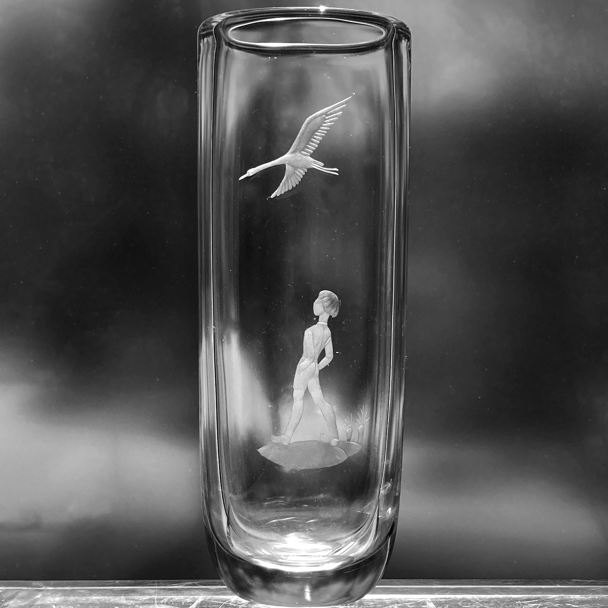 Orrefors employed master artists and craftsmen, like Palmqvist and Rosenstam, many of whom worked their whole careers of 40, 50, or more years with the company. Sven Palmqvist (1906-1984) was born in the glass district of southern Sweden and started his career with Orrefors in 1928, where he remained until 1972. In those years, he designed hundreds of engraved glass motifs. According to his daughter, to whom I am connected through an online glass group, he had a particular fondness for portraying people and animals. Palmqvist is known not only for his graceful and functional designs, but he is also known for his innovative techniques in glass production.